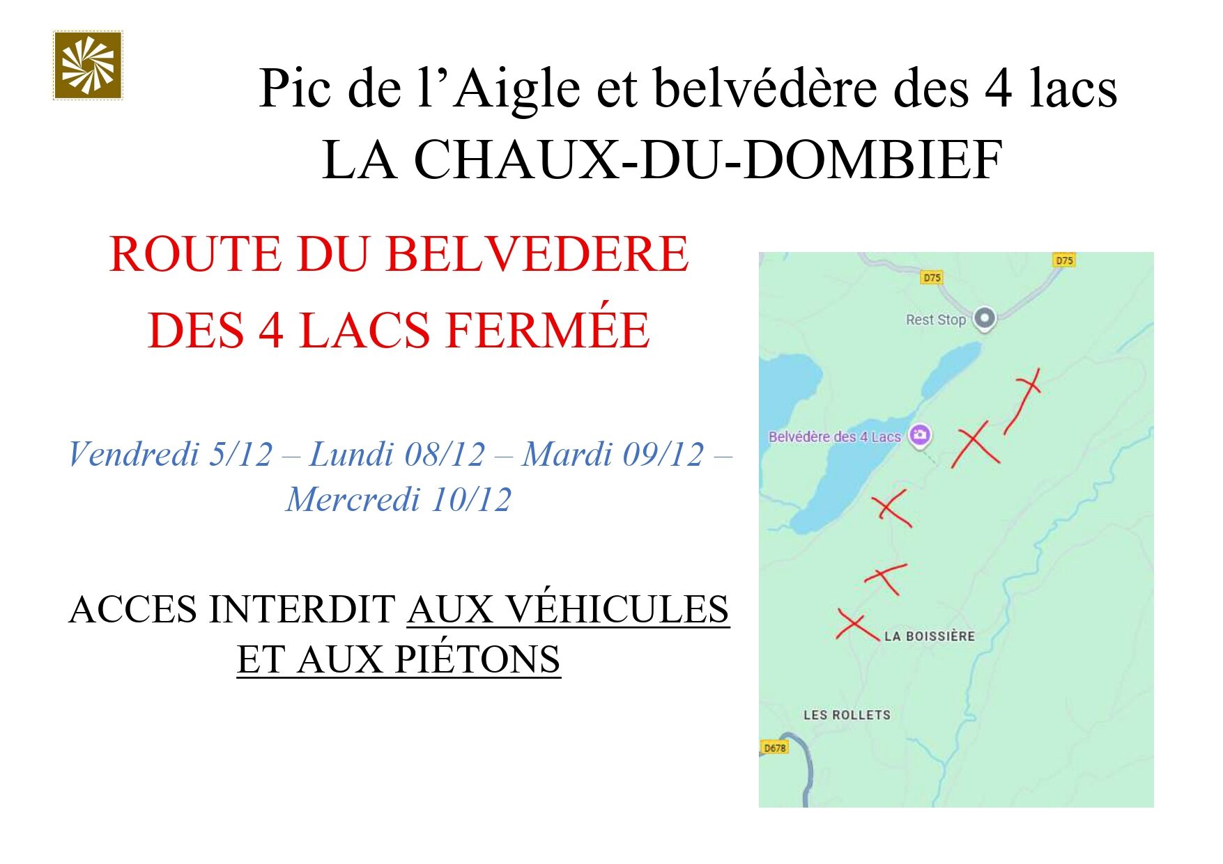 La route du belvédère des 4 lacs sera fermée vendredi 5, lundi 8, mardi 9, mercredi 10.