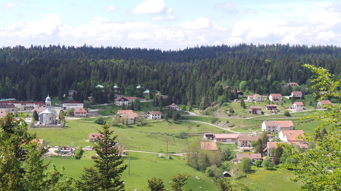 Depuis les belvédères, de larges perspectives s'ouvrent sur la combe et ses cours d’eau sinueux, tandis qu'à l’est, les sommets de la Haute-Chaîne du Jura soulignent l’horizon.