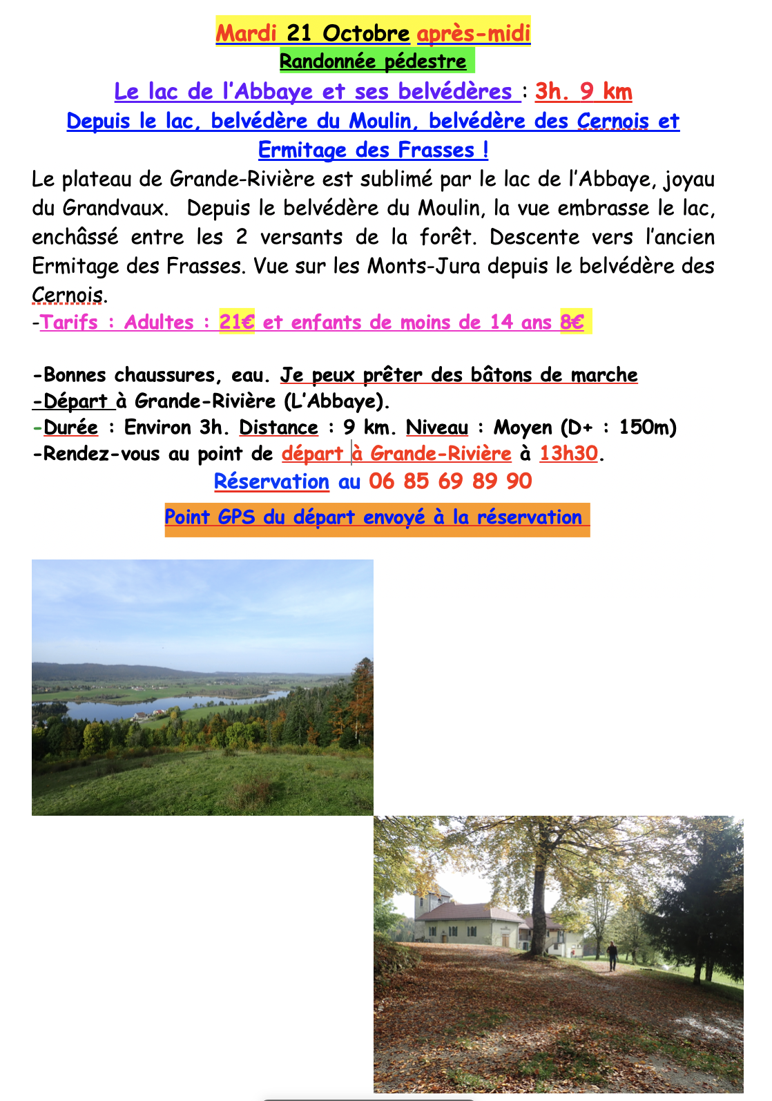 Le plateau de Grande-Rivière est sublimé par le lac de l'Abbaye, joyau du Grandvaux. Depuis le belvédère du Moulin, la vue embrasse le lac, enchâssé entre les 2 versants de la forêt. Descente vers l'ancien Ermitage des Frasses. Vue sur les Monts Jura depuis le belvédère des Cernois.
