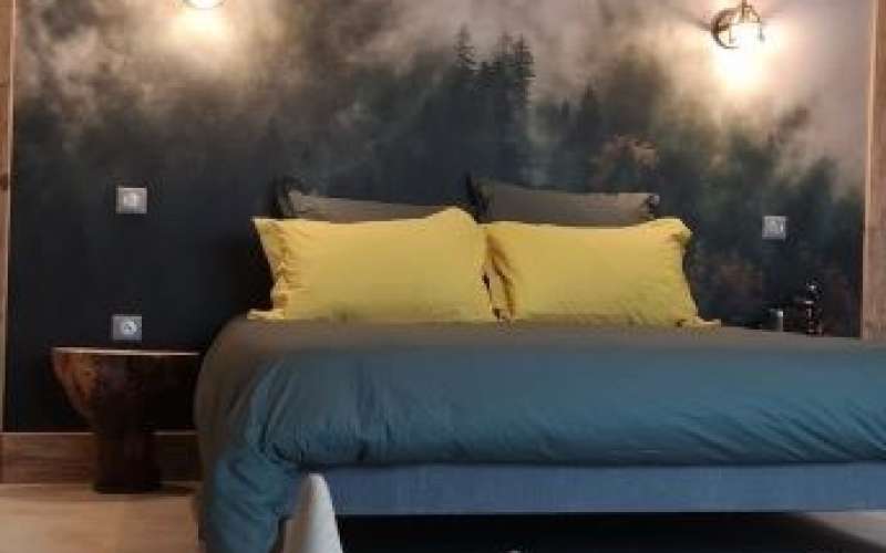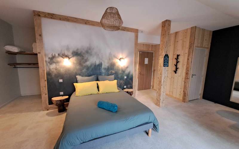La chambre "Grumes et brouillard" de 55m2 pour 4 personnes (2 adultes et 2 enfants) est composé d'un lit double et d'un canapé convertible. Cette grande chambre sous les toits vous transporte au cœur des belles forêts jurassiennes. Dormez entre les sapins présidents et des épicéas géants.