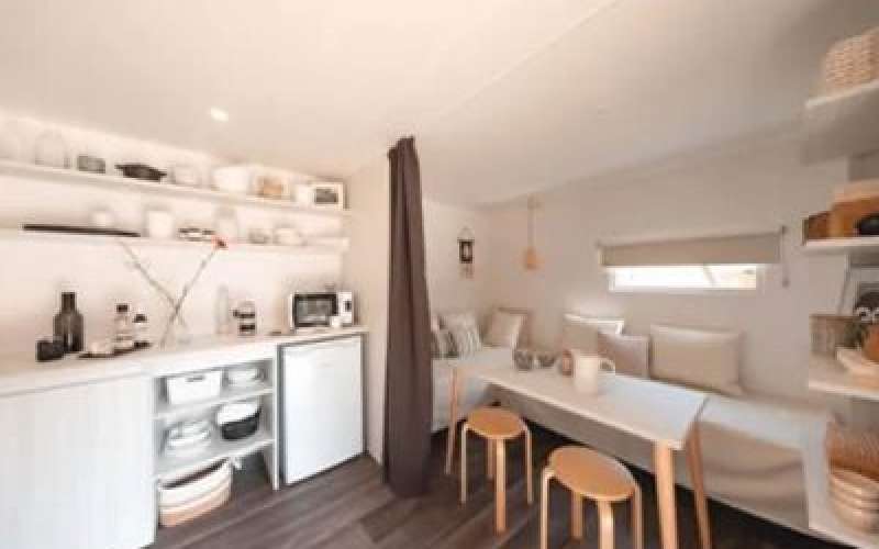 D'une surface de 15,5m2 avec un abris auvent de 13,9m2, il est composé d'une chambre avec un lit double (140), d'une chambre avec 2 lits simples (80) qui se transforme en un tour de main en salon, coin cuisine (plaque de cuisson, réfrigérateur, micro onde, cafetière et vaisselle courante).