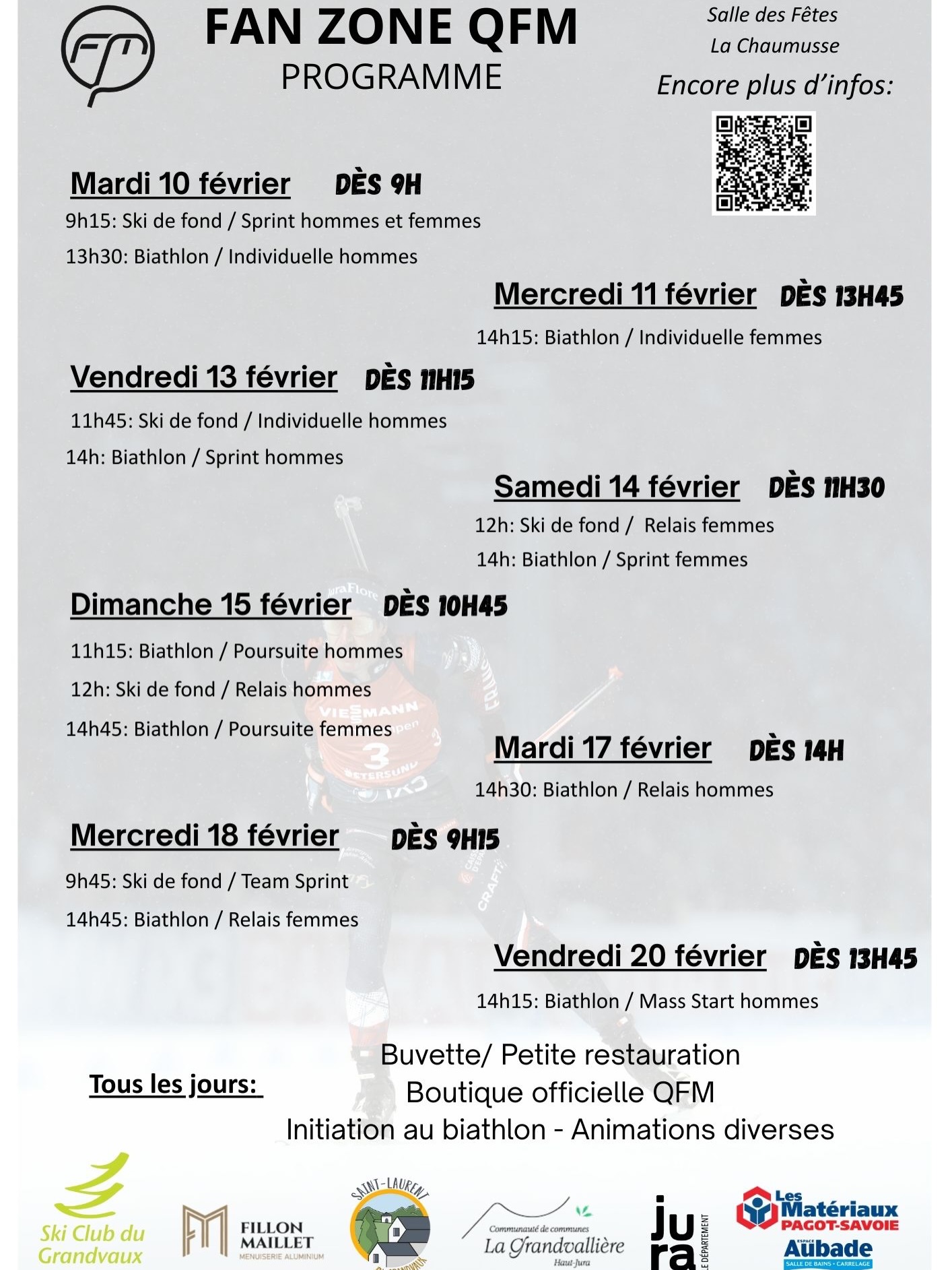 Sur place tous les jours : buvette, initiation au biathlon, boutique officielle QFM et d’autres animations seront proposées.