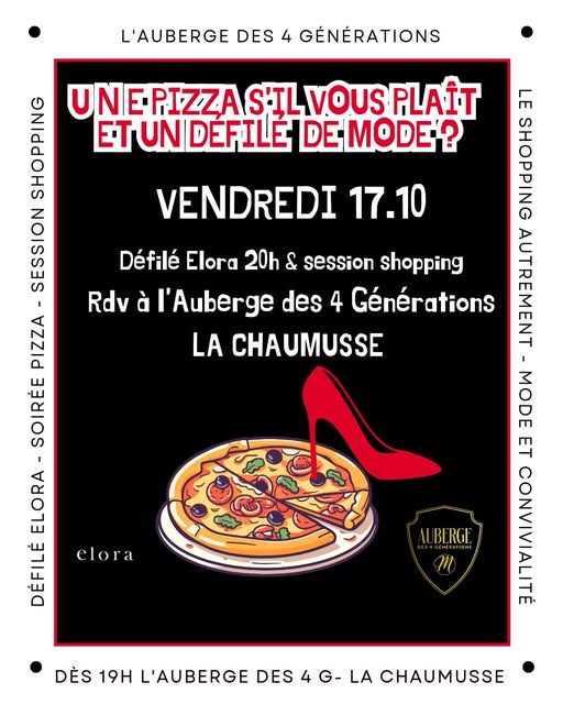 Venez découvrir, dans une ambiance conviviale, un défilé Elora, suivi d’une soirée pizza.