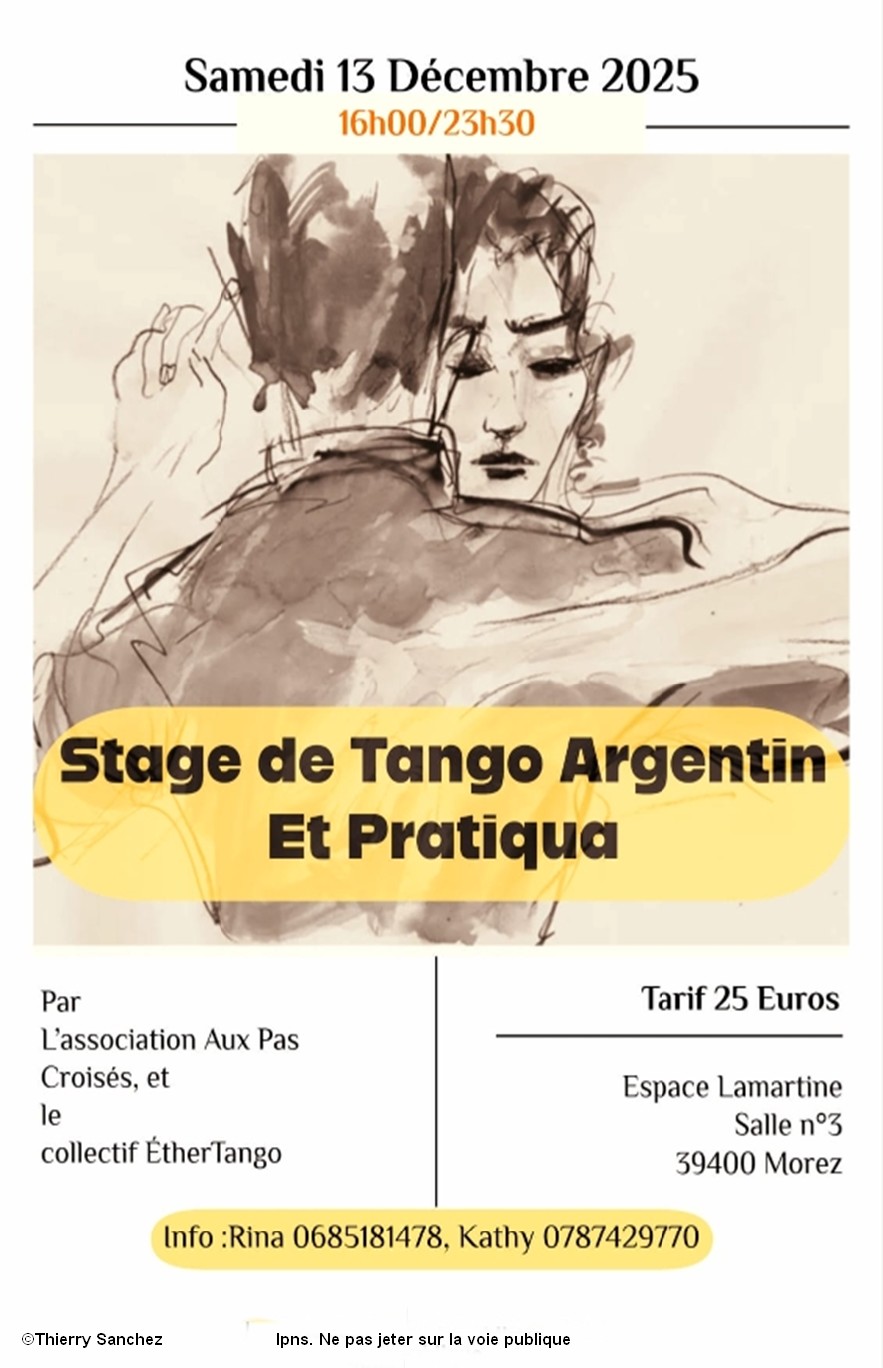 Stage de tango argentin (le tango c'est plus qu'une danse, c'est une émotion à deux) de 16h à 23h30 avec une pause pour une petite restauration.