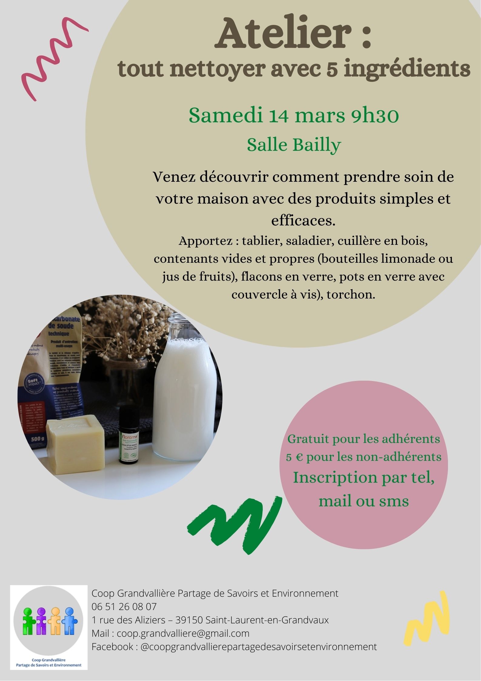 Laure nous montre comment faire des produits ménagers efficaces avec quelques matières premières simples. Apportez : tablier, saladier, cuillère en bois, contenants vides et propres (bouteilles limonade ou jus de fruits), flacons en verre, pots en verre avec couvercle à vis), torchon.