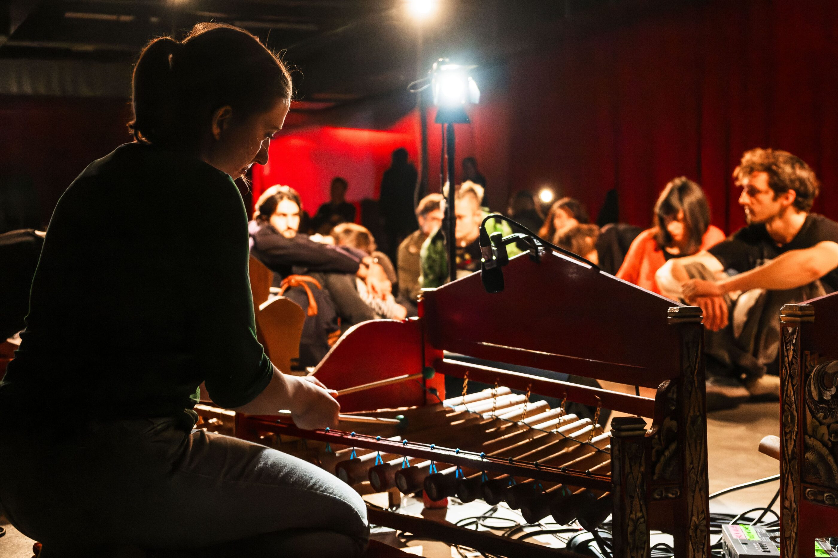 Dim. 26 Avr. - 17h00 au café de la Maison du Peuple à Saint-Claude. Instrument impressionnant, le Gamelan est ici étendu par l’Ensemble Batida vers d’autres horizons. Am Angklungklang emprunte le savoir-faire des nouvelles technologies pour donner au projet un caractère électronique organique, tout en conservant la puissance extrême de sa facture acoustique, pour un résultat innovant et chaleureux. L’Ensemble Batida se lance avec ce projet dans une “préparation” de ses deux Gamelans à l’aide de haut-parleurs/transducteurs et du traitement en temps réel. Le Gamelan ainsi préparé devient augmenté, puissant et mystérieux. La scène se transforme en une place de village sur laquelle le public est libre de s’installer au centre du Gamelan ou de circuler autour, de rester durant la performance complète ou de partir en cours pour peut-être y revenir plus tard.