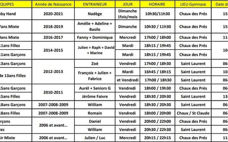 Moins de 18 ans filles (2007-2009) : vendredi 18h/20h.