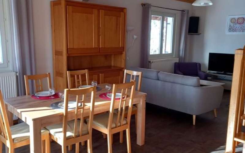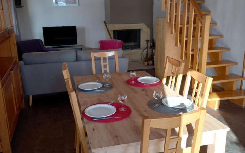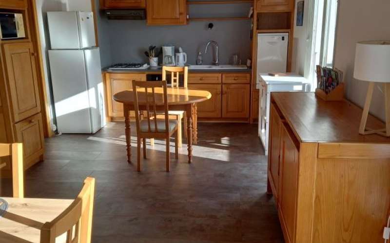L'appartement "le Bois Joli" au 1er étage de la maison du propriétaire se compose d'une pièce de vie avec cuisine toute équipée, d'un salon avec TV et cheminée, de 2 chambres avec 2 lits de 140, d'une salle d'eau avec douche et d'un WC indépendant.