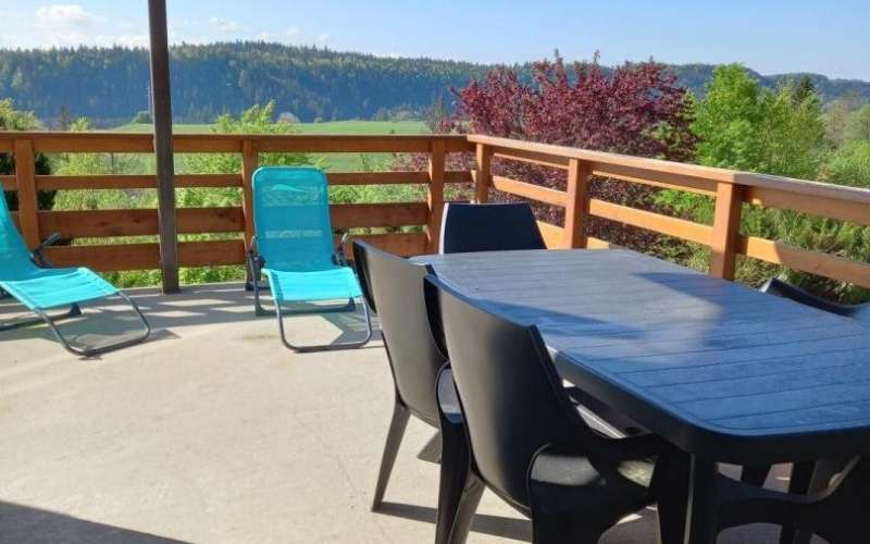 Côté extérieur, vous pourrez profiter, l'été d'une vue panoramique sur les Monts Jura depuis la terrasse équipée avec salon de jardin et barbecue.