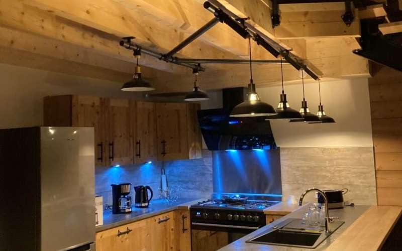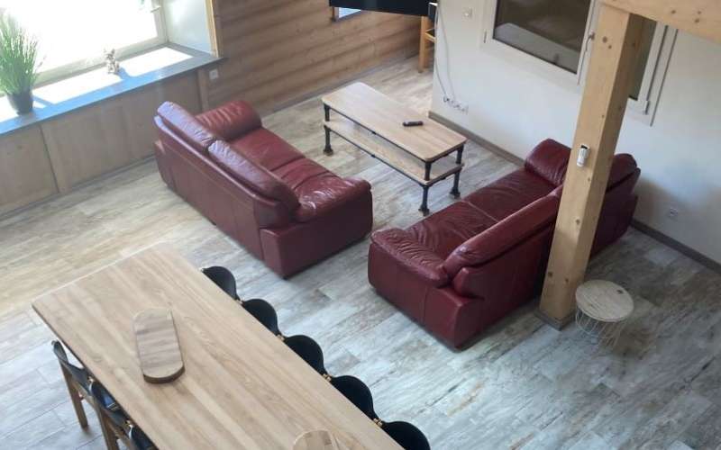 Cuisine toute équipée en bois , ouverte sur une grande salle de séjour avec grande table. Salon avec canapés, TV,