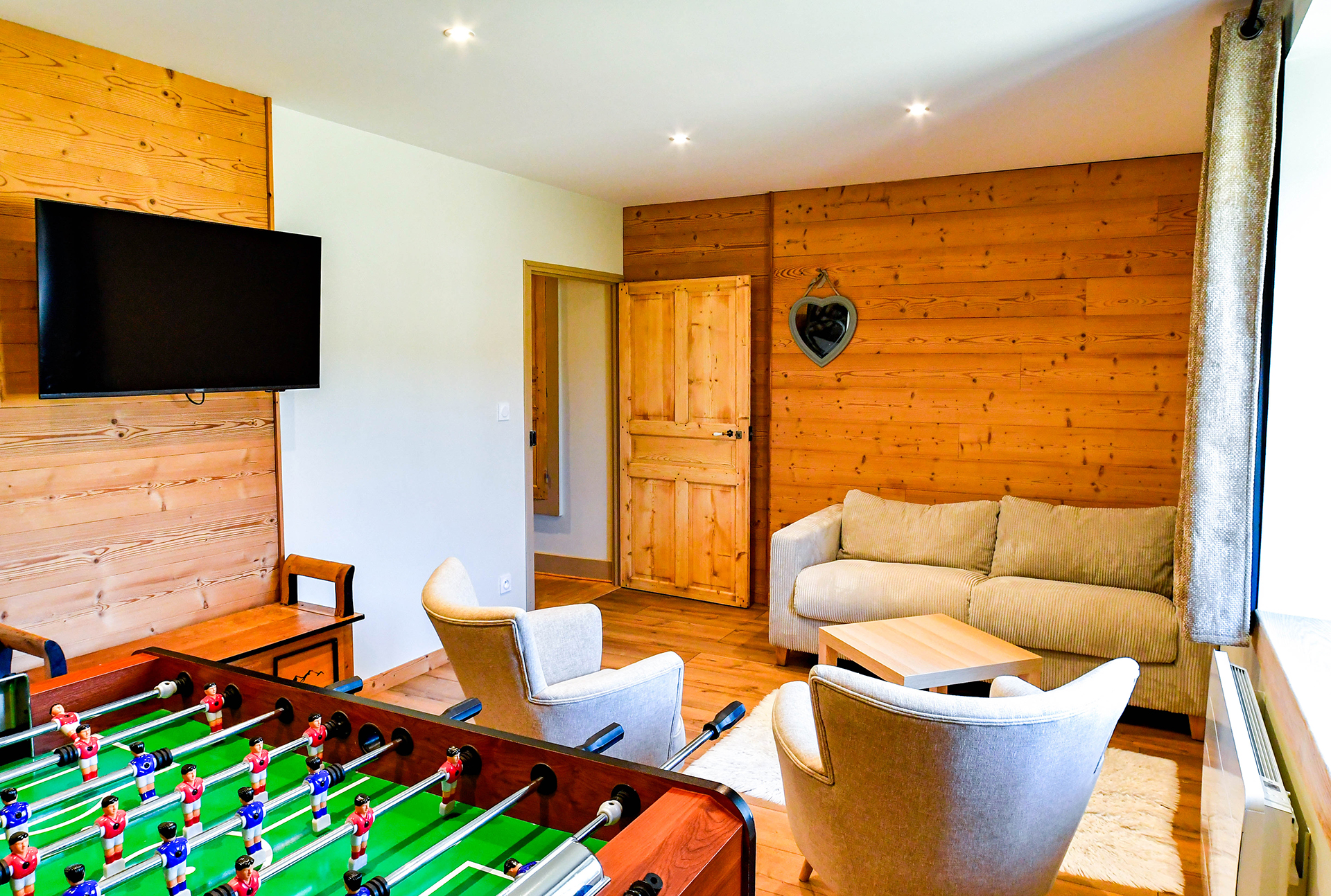 . 1 petit salon avec télé, baby foot et canapé convertible