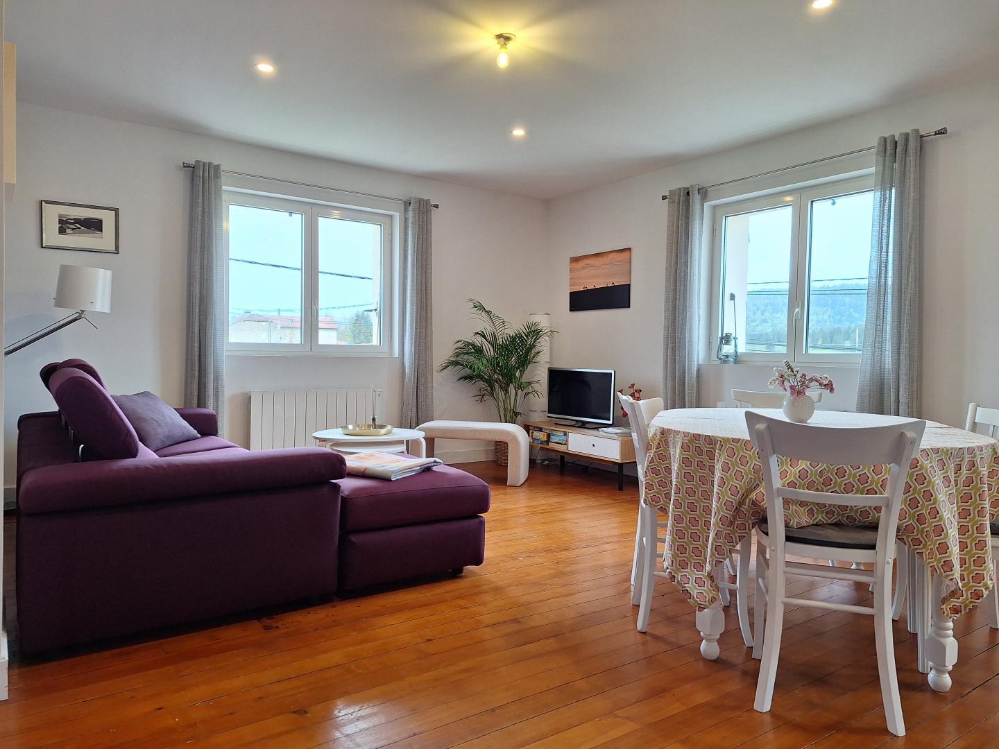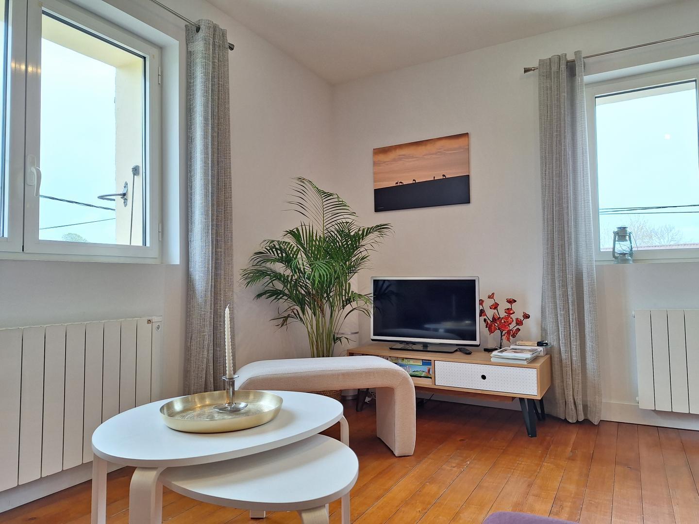 Avec son entrée indépendante, ce gite situé au 1er étage offre 2 belles chambres, un grand séjour avec coin salon et une cuisine toute équipée.