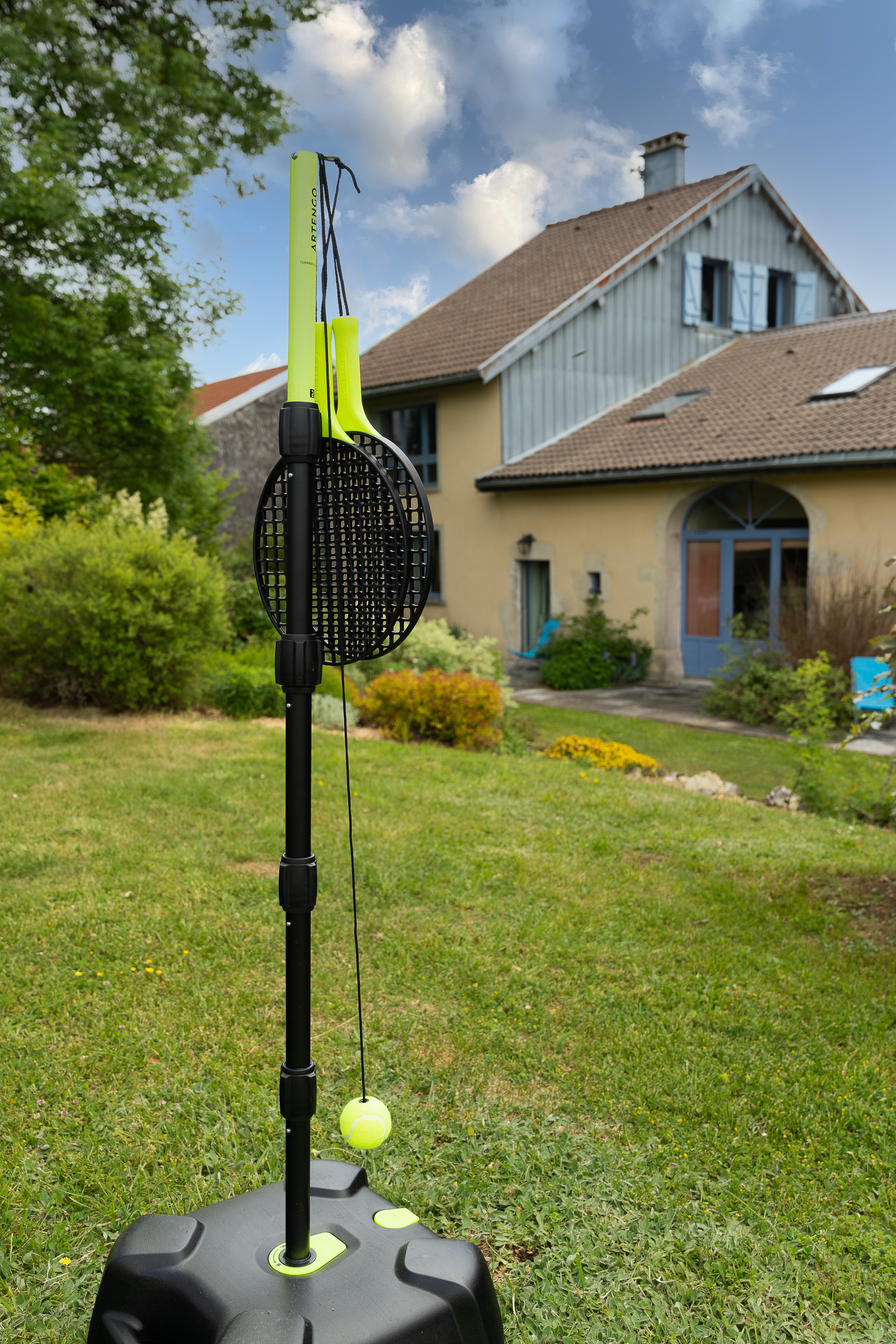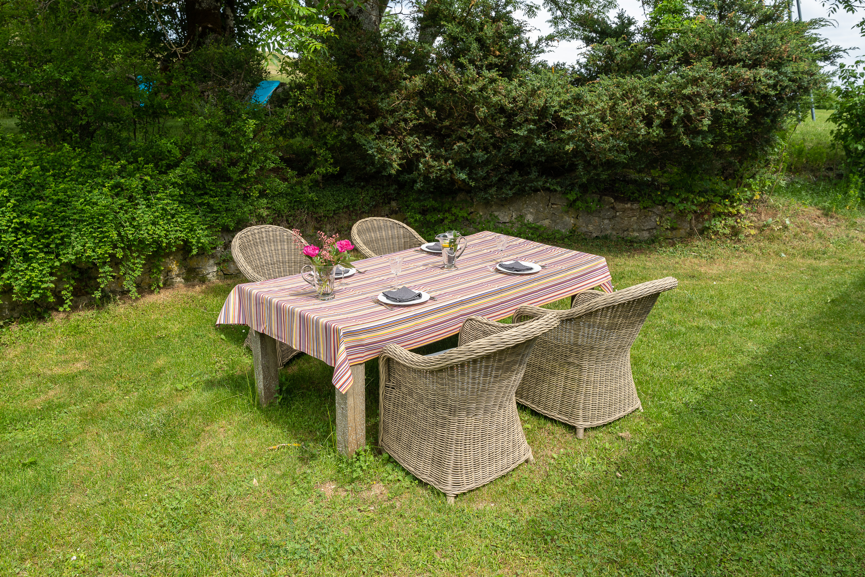 Cour et jardin non clos, salon de jardin, barbecue.