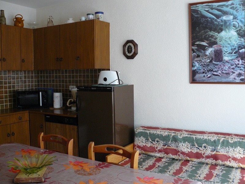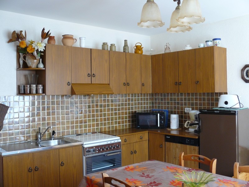 Hall d'entrée avec vestiaire, cuisine-séjour avec lave-vaisselle, cuisinière gaz électricité, micro-ondes, lave linge, lave vaisselle, canapé et téléviseur.