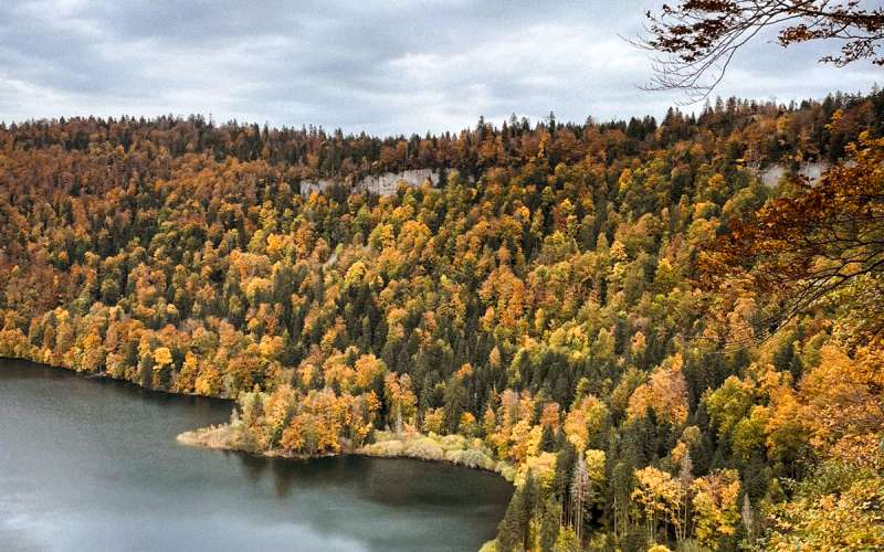 Niché dans son écrin forestier, le belvédère de Maguenay surplombe le lac de Bonlieu, vous présente les plateaux du Jura...