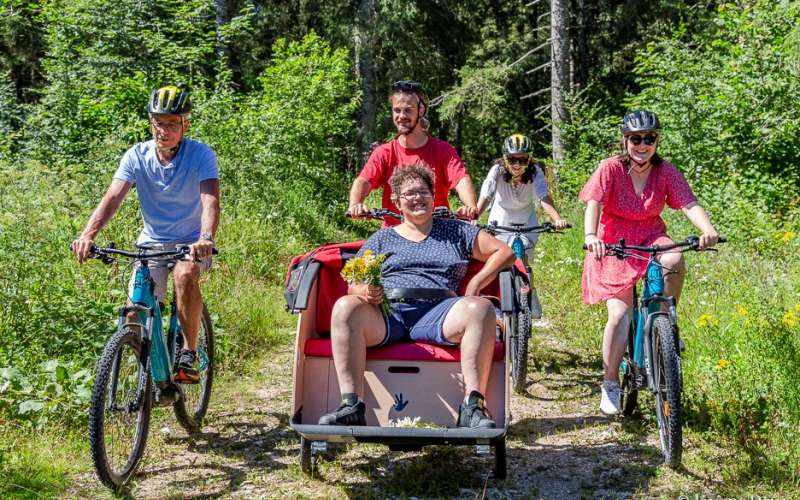 Également disponible, un vélo-pousse à assistance électrique pour un binôme pilote / personne en situation de handicap