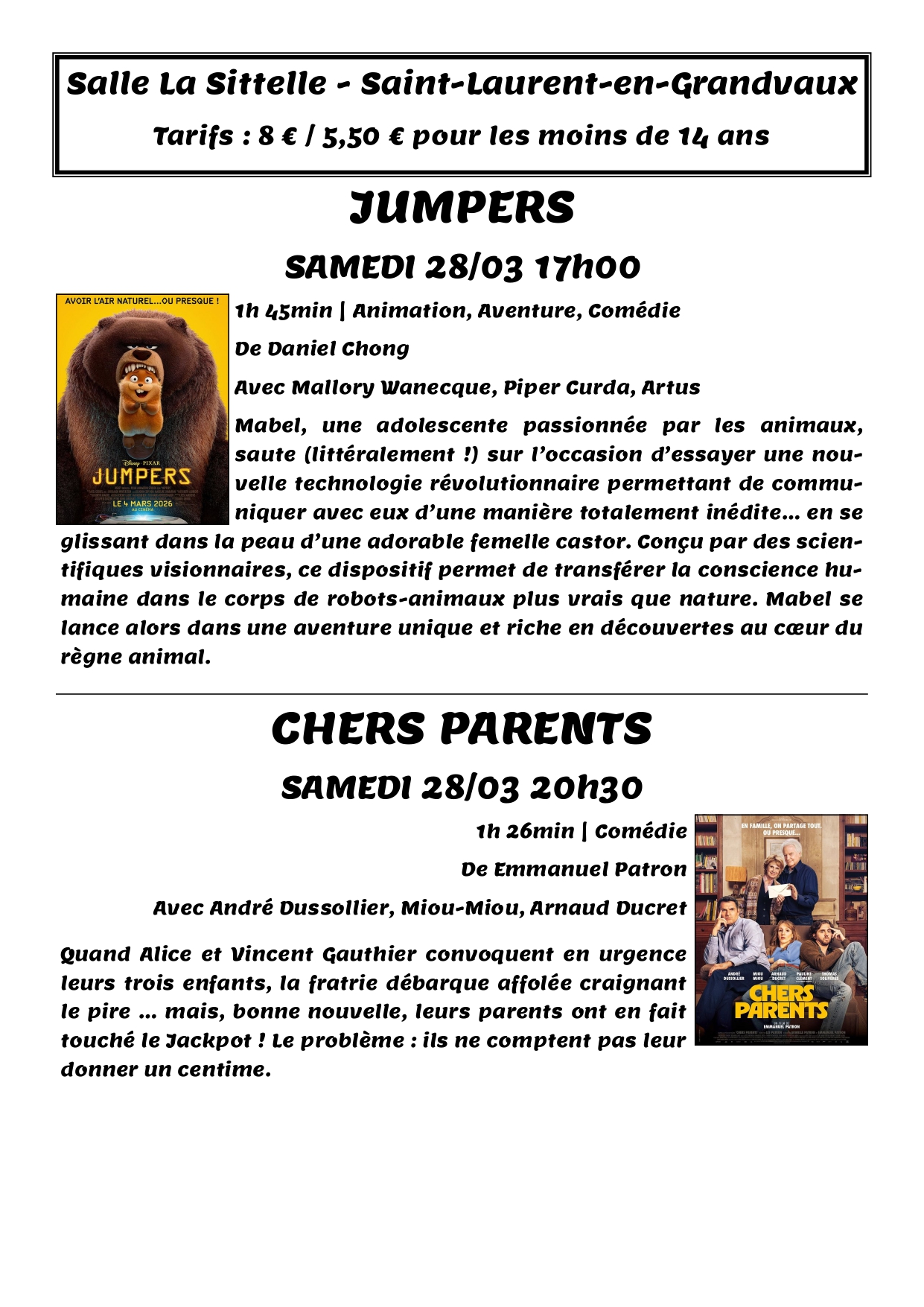 Projections cinéma à La Sittelle samedi 28 mars 2026 :