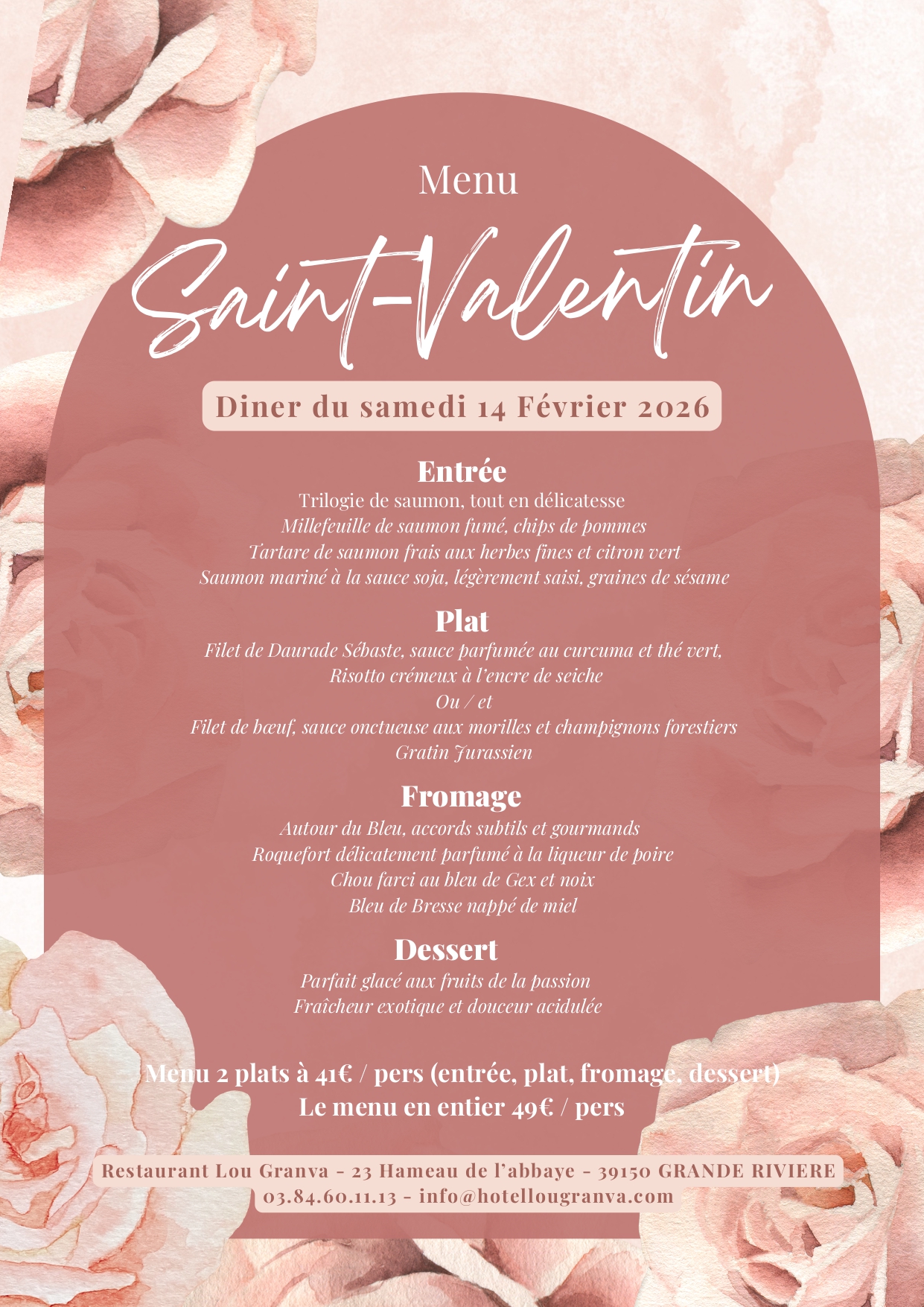 Menu de la Saint-Valentin à l'hôtel-restaurant Lou Granva à Grande-Rivière-château samedi 14 février 2026 :