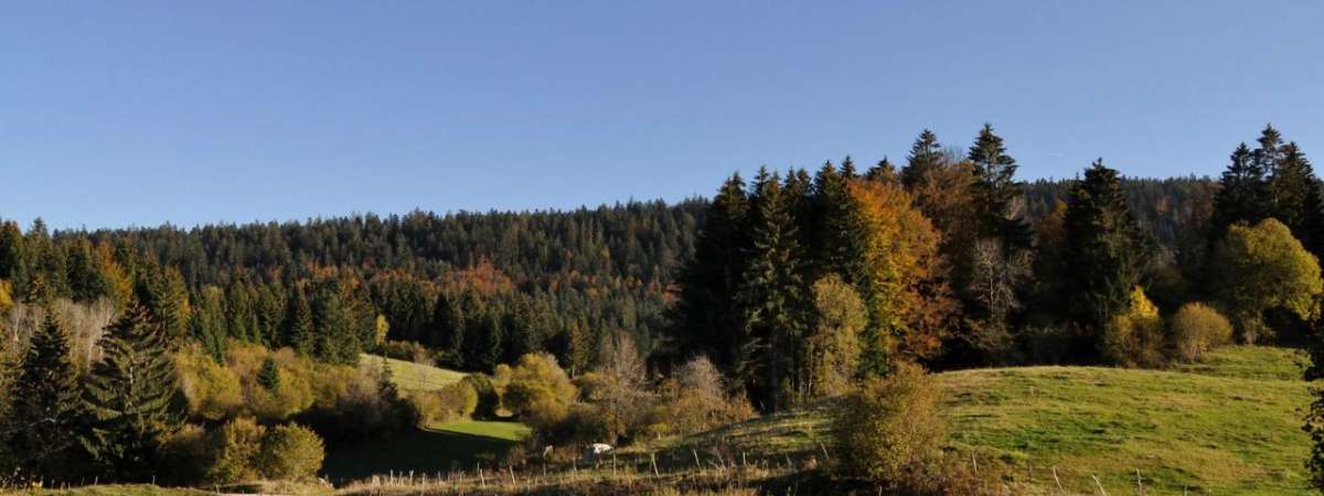 2. Poursuivre en parallèle de la route départementale et au poteau Les Planchettes, emprunter sur la gauche un chemin carrossable arboré débouchant 1 km plus loin sur la route départementale, que l'on suit prudemment sur la gauche.