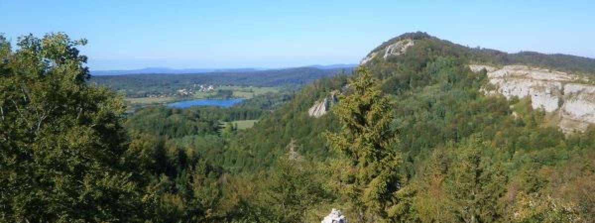 Du parking, remonter la route sur une centaine de mètres où l’on découvre côté droit le premier des quelques 150 cairns qui jalonnent l’itinéraire, offrant aux enfants une activité ludique de reconnaissance du parcours façon « jeu de pistes ». Le sentier parvient à une première clairière avec une petite aire de repos sous une jolie tâche de hêtres. Il s’élève ensuite vers un premier belvédère agrémenté d’un banc incitant à la contemplation (vue sur Mont Blanc, une partie des Alpes, la chaîne des Monts Jura, du Risoux et du Risol). Un second belvédère offre les mêmes panoramas avec en prime le lac d’Ilay, le Le Pic de l’Aigle et le premier plateau. Après un passage rocheux un peu escarpé, le sentier longe les falaises de Chaux du Dombief (ne pas quitter l’itinéraire et ne pas s’approcher de ces falaises). Il serpente ensuite pour retrouver les pâturages, passe sur une jolie passerelle en bois avant de ramener le promeneur au lieu de départ.