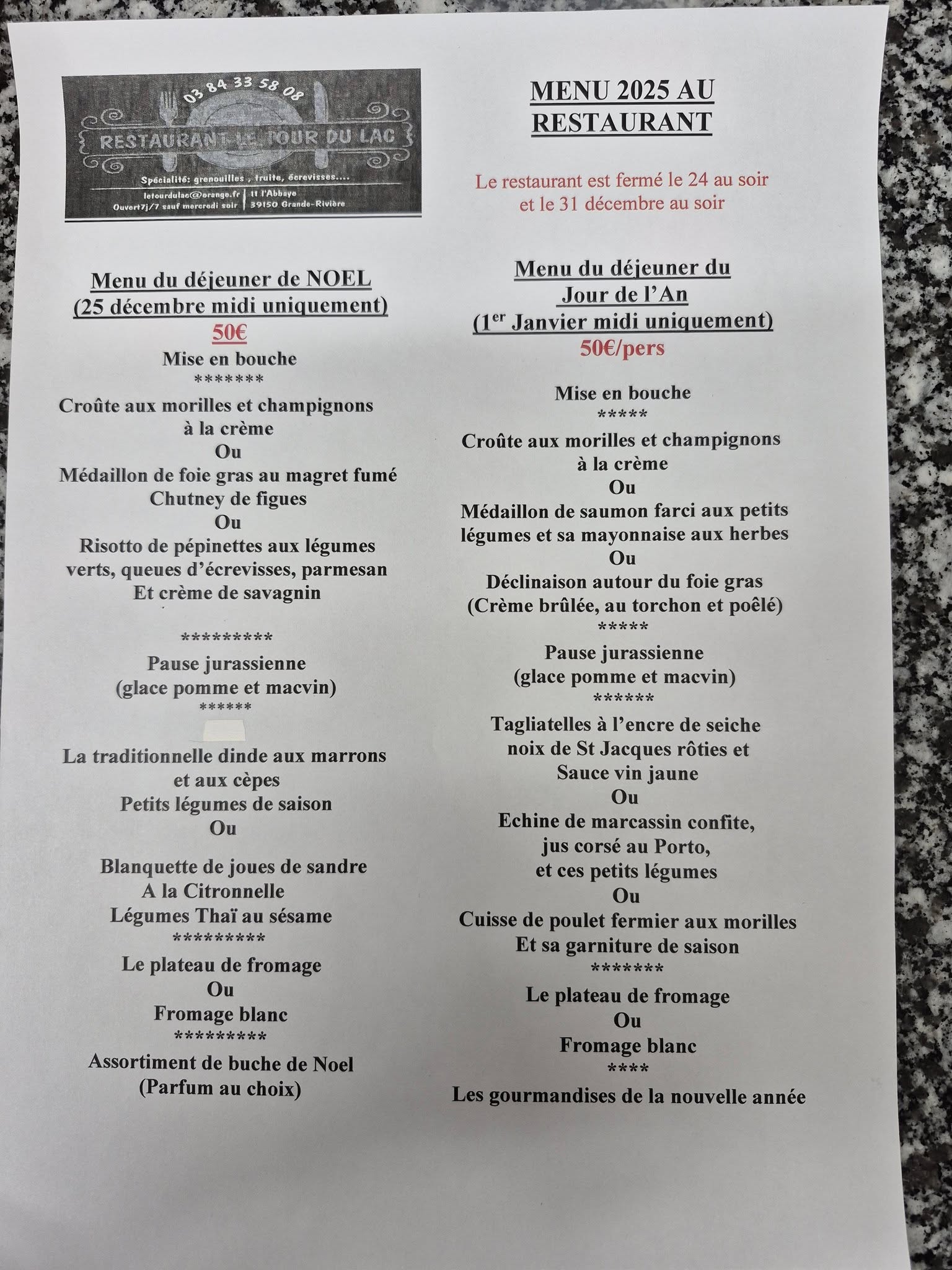 Menu du déjeuner du jeudi 25 décembre 2025 au Restaurant Le Tour du Lac (midi uniquement)